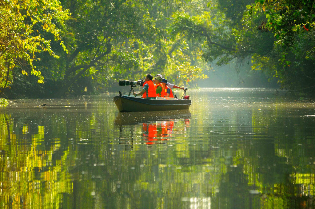 Desde allí, el viaje continúa hacia el Kinabatangan Wetlands Resort, a orillas del legendario río Kinabatangan. Un crucero al atardecer ofrece un espectáculo natural: monos narigudos, elefantes pigmeos, cálaos y cocodrilos son avistados frecuentemente en las orillas del río, mientras el atardecer tiñe la selva con tonos dorados. Por la noche, el escenario cambia: las luciérnagas iluminan las orillas, creando un ambiente casi mágico.