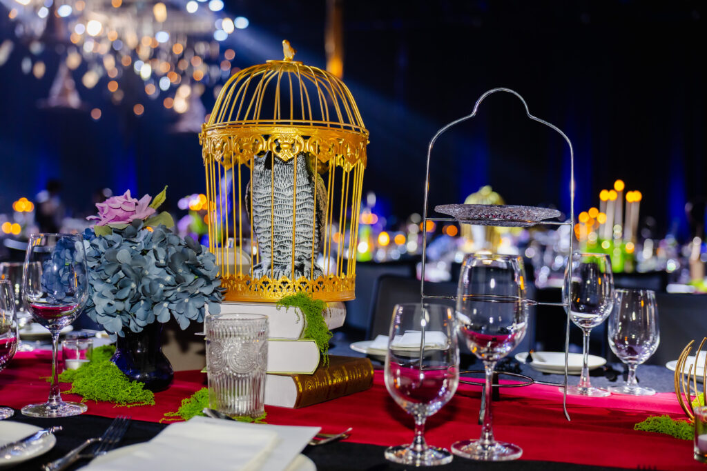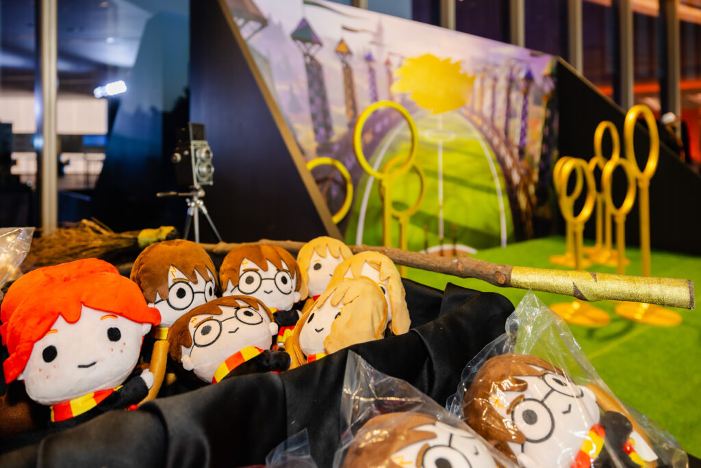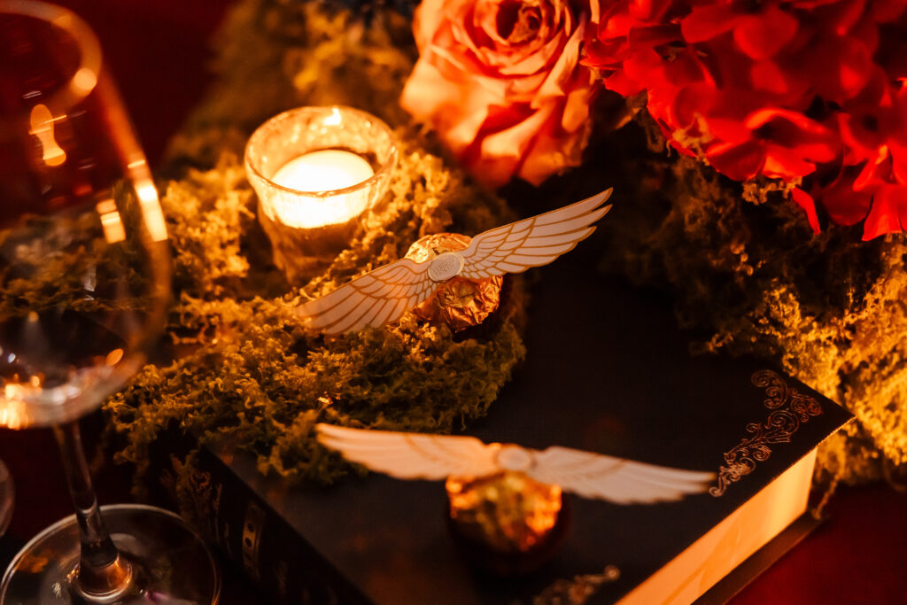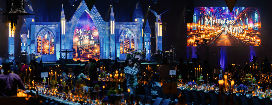 Una de las experiencias más destacadas fue la cena inspirada en Harry Potter, en la que los invitados fueron recibidos en un entorno escenográfico que evocaba el universo de la saga. Iluminación dramática, mesas compartidas, vestuarios y performances ayudaron a crear una atmósfera envolvente, transformando la cena en un espectáculo interactivo.