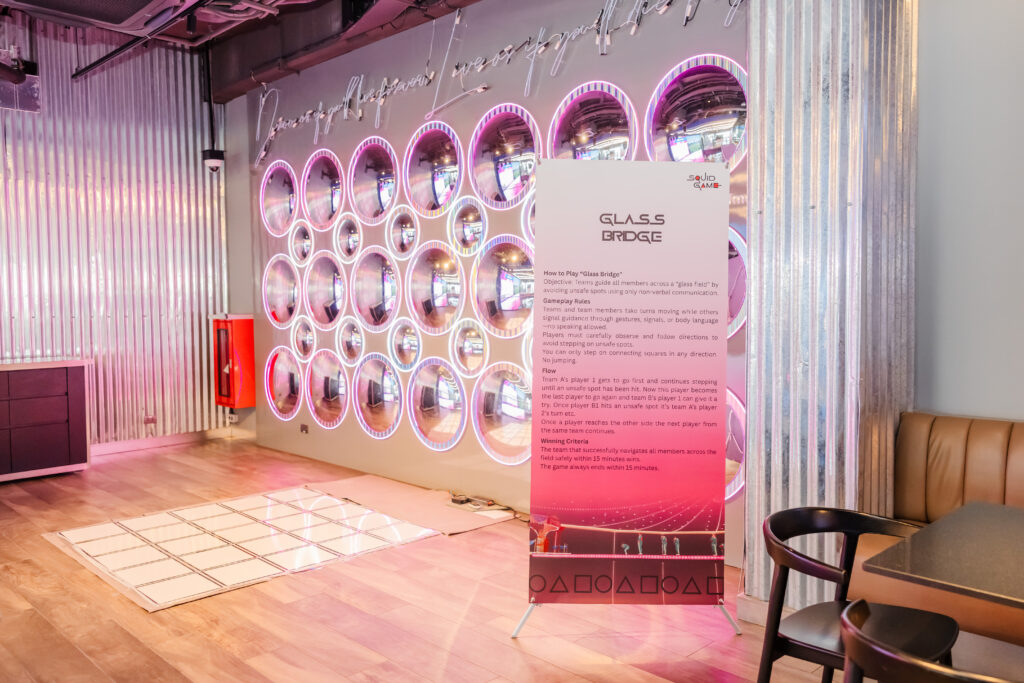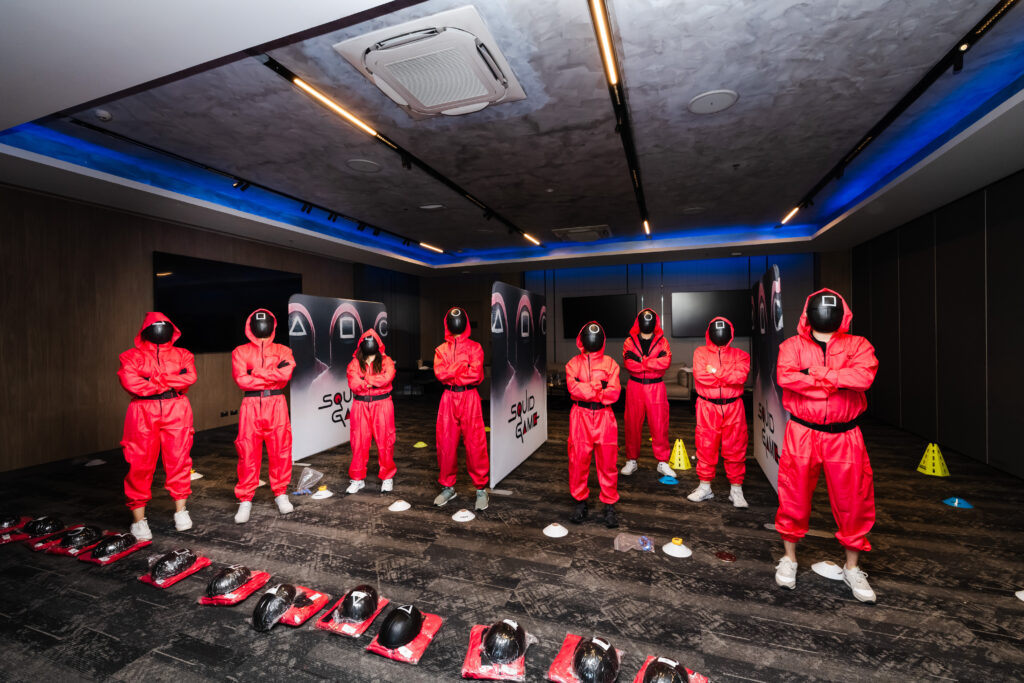 En otro momento, el grupo fue transportado al universo de Squid Game (El Juego del Calamar). La experiencia se construyó a partir de desafíos y activaciones inspiradas en la serie, adaptadas a un contexto corporativo. Escenarios geométricos, dinámicas de juego y personajes caracterizados crearon una ambientación impactante, a la vez divertida y cuidadosamente controlada.